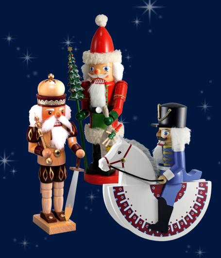 Typische Nussknacker sind stolze Gesellen. Als Könige, Husaren oder tapfere Reiter sind sie imposante Erscheinungen. Dafür sind die Figuren mit edlen Materialien wie Borten, Fellen und Ketten geschmückt und tragen Uniformen in kräftigen Farben. Unser Angebot umfasst neben klassischen Nussknackern auch moderne Adaptionen in Form von Sportlern, Gelehrten, Zauberern oder einem Spielzeughändler.