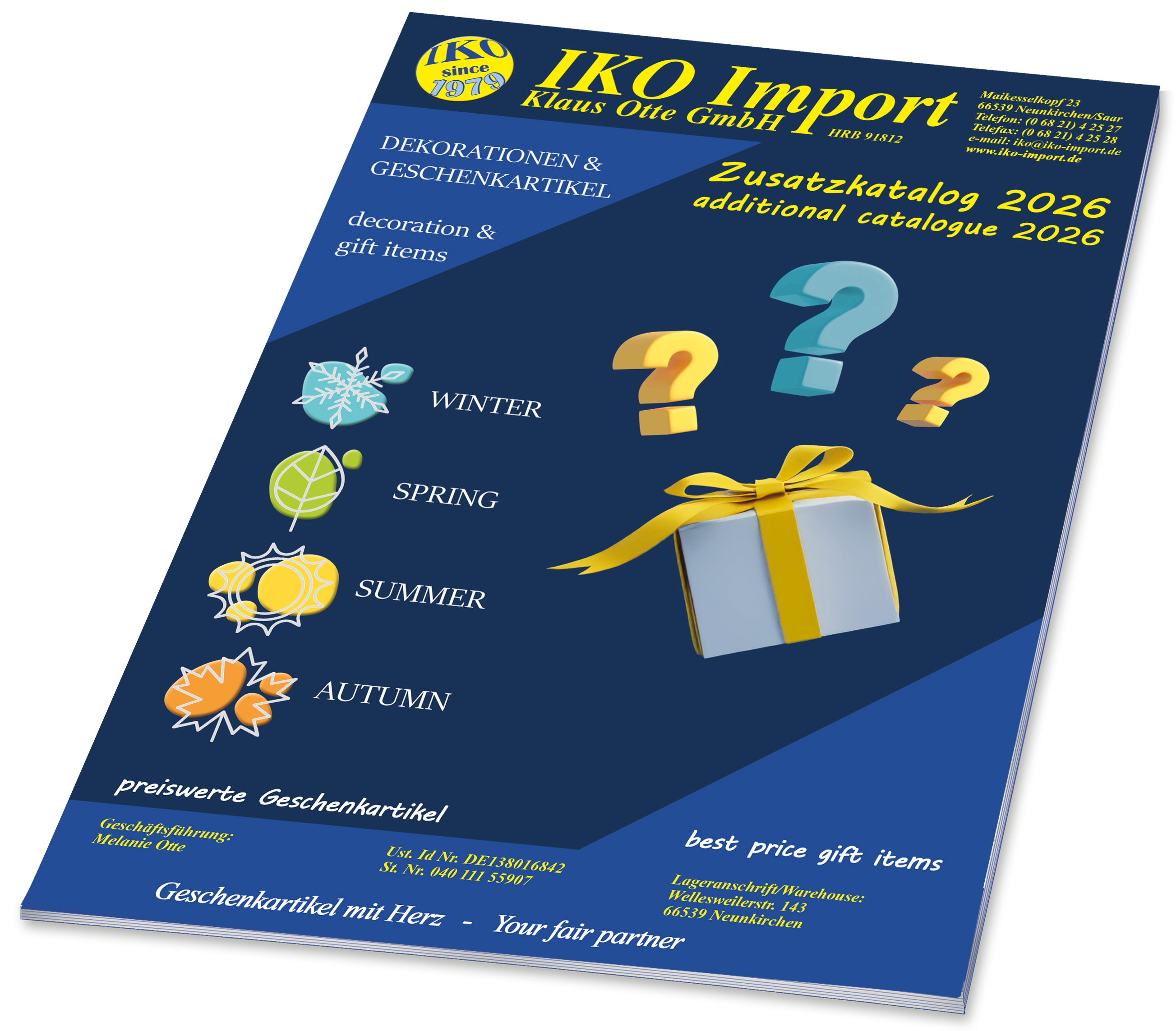 Seit über 40 Jahren ist unser Familienunternehmen IKO-Import erfolgreich im Geschenk- und Dekoartikel-Großhandel tätig – und das international! Unsere Kunden genießen verschiedene Vorteile wie günstige Preise und schnelle Lieferungen. Profitieren auch Sie von unseren weitreichenden Kontakten und überaus attraktiven Bedingungen: