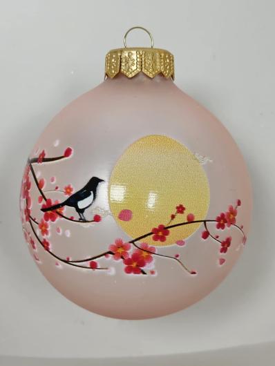 Diese zarte Glaskugel zeigt ein elegantes Design mit einer Elster, die auf blühenden Kirschzweigen unter einem goldenen Vollmond sitzt. Der weiche pastellrosa Hintergrund unterstreicht die Eleganz der feinen Muster und macht diese Kugel zu einem perfekten Symbol für Ruhe und natürliche Schönheit. Ein modernes, maschinell dekoriertes Meisterwerk, das jeder Weihnachtsdekoration Charme und Raffinesse verleiht.