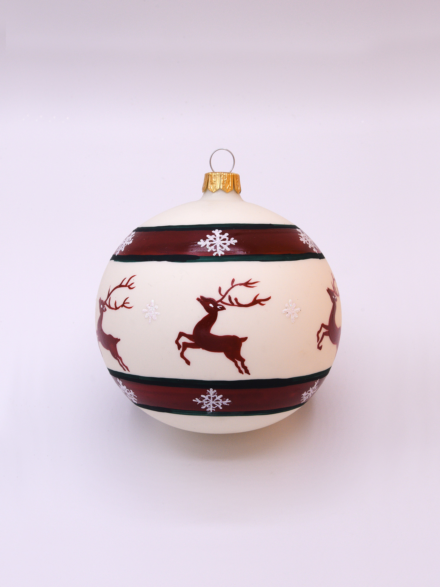 Weihnachtlicher Glasschmuck in wollweiß Farbe mit Hirschen um die Kugel und roter Dekoration.