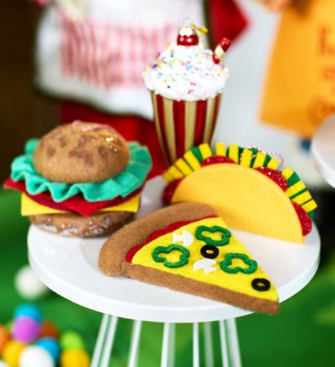 Hanging ornaments made out of felt that replicates food