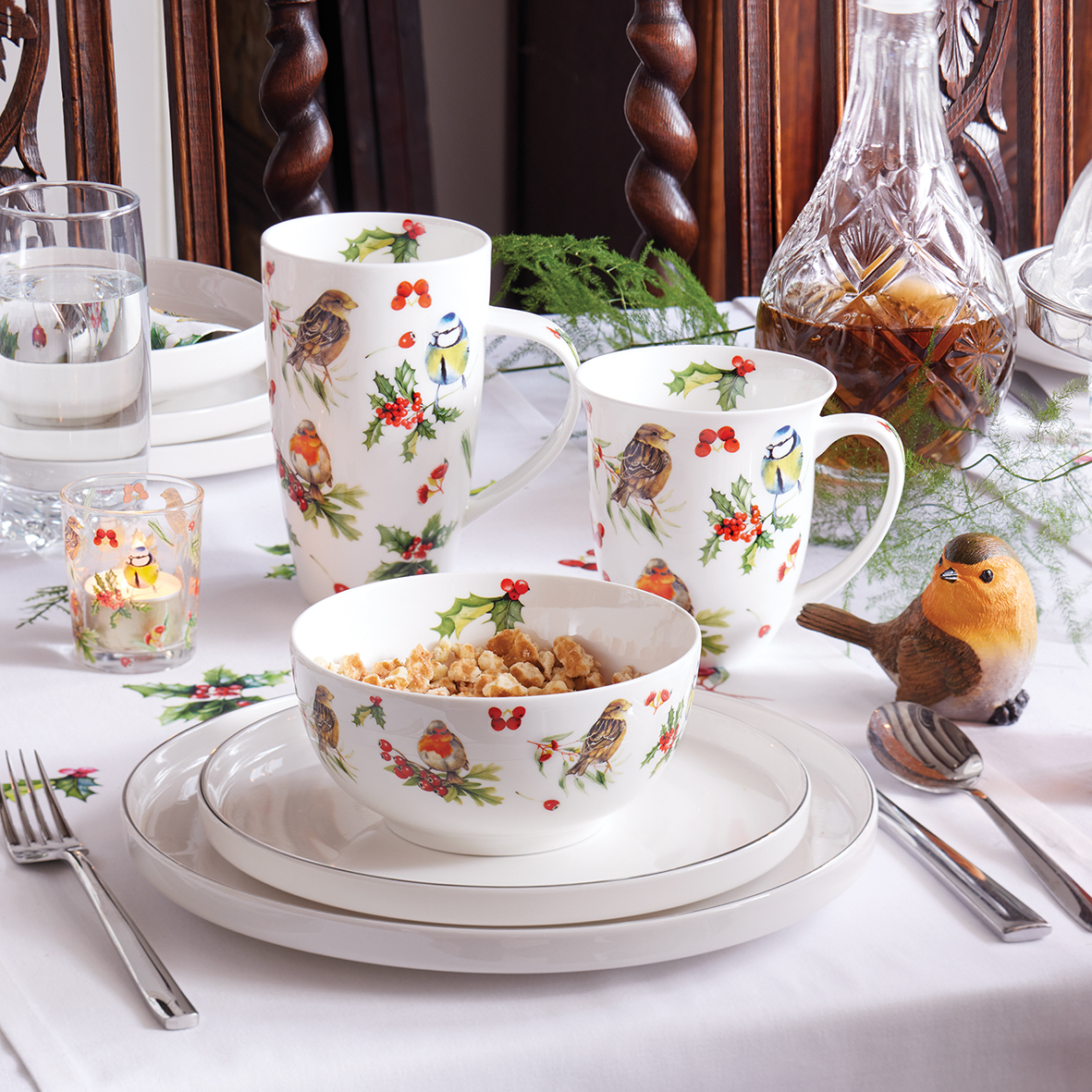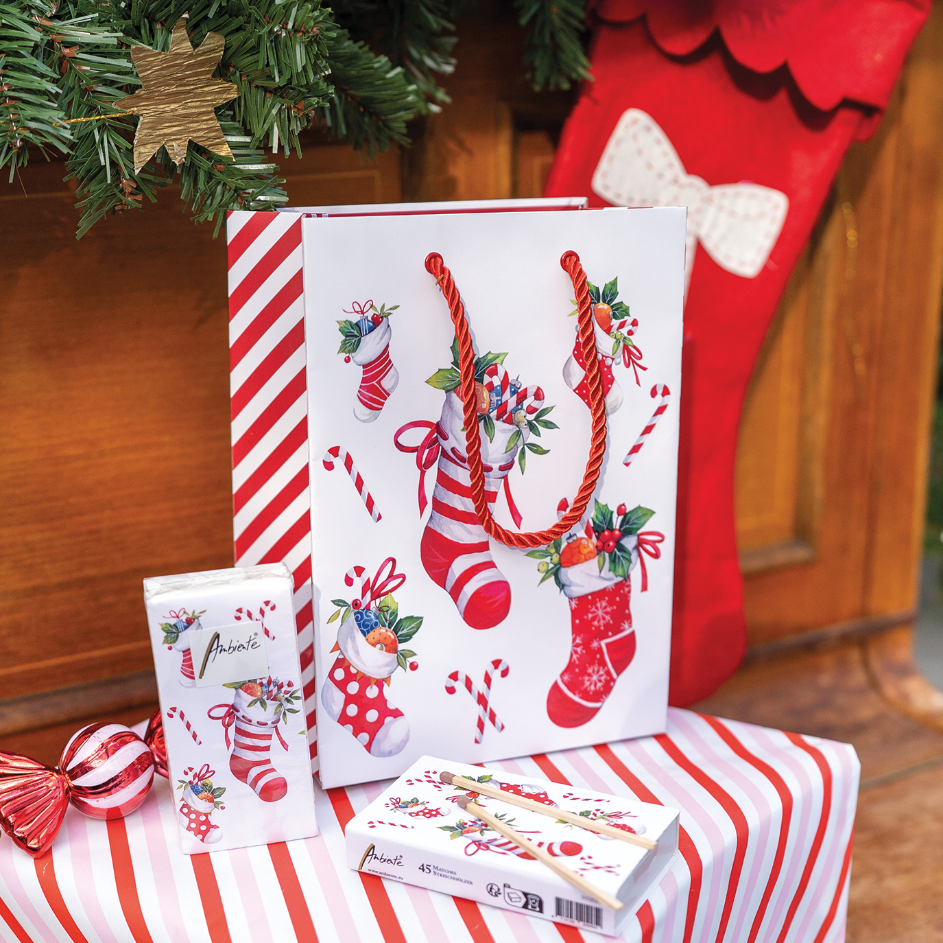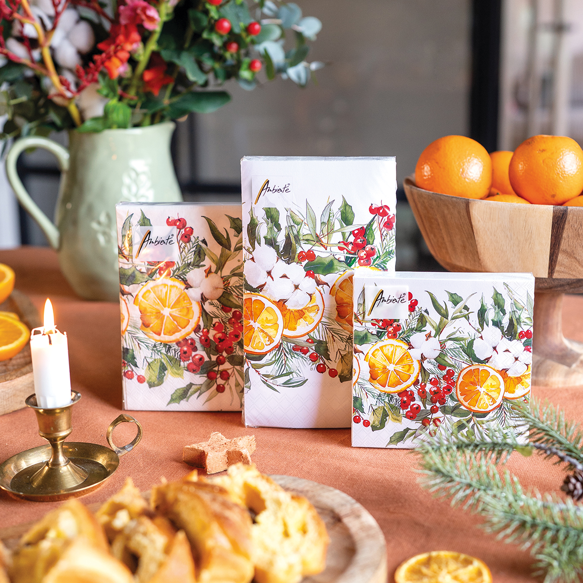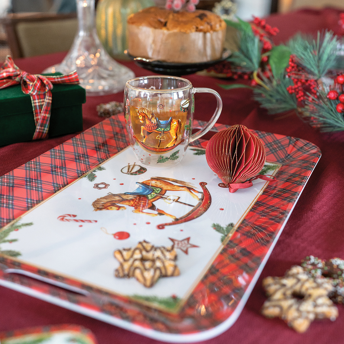 This dynamic and light-hearted series is perfect for creating an uplifting and family-friendly atmosphere. The collection includes napkins (lunch and cocktail size) and is expanded with coordinated accessories like candles in two sizes, matches, a gift bag, three sizes of porcelain mugs, a double-walled tea glass, loose leaf tea in a festive bag, trays (two sizes), a placemat, tea light holder, water glass, storage jars, a kitchen towel, cushion cover, oven mitt and pot holder.