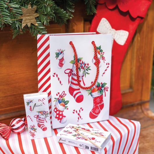 The X-Mas stockings collection from Ambiente Europe celebrates one of the most heartwarming festive customs: hanging stockings by the fireplace. This lively all-over design shows bright red Christmas stockings filled with little gifts, sweet treats and branches – ready to surprise. The charming illustration style and festive colour palette make it perfect for joyful Christmas tables and creative product displays.