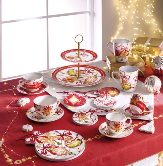 Sparkling toasts and a festive table: goblets and flutes with gold rims, stretch gold cutlery, decorated plates, trays, mugs and espresso cups transform every moment into Christmas magic. With Gioco di Luci, the table is dressed in red, gold, and luminous atmospheres.