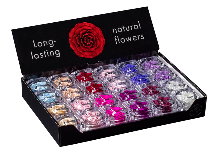 The Gift Box Jewel features an eternal rose in a diamond-shaped box (5 × 5 × 4.5 cm), presented in a display of 24 pieces. This charming gift is gift ready, making it immediately suitable for retail sales. The small yet refined box, combined with the luxurious appearance of the preserved rose, makes it an ideal gift for gift shops and as a representative present in the hospitality sector. Thanks to the long-lasting preserved rose, the gift remains beautiful over time without any care—perfect for businesses looking for a sophisticated, maintenance-free gift.