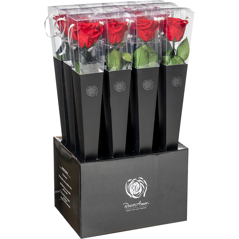 The preserved rose requires no maintenance, yet retains its beauty and colour for months or even years. Thanks to its high-quality craftsmanship and the clear acrylic packaging, this product is also perfectly suited as a representative gift in the hospitality industry or as a decorative element in modern interiors.