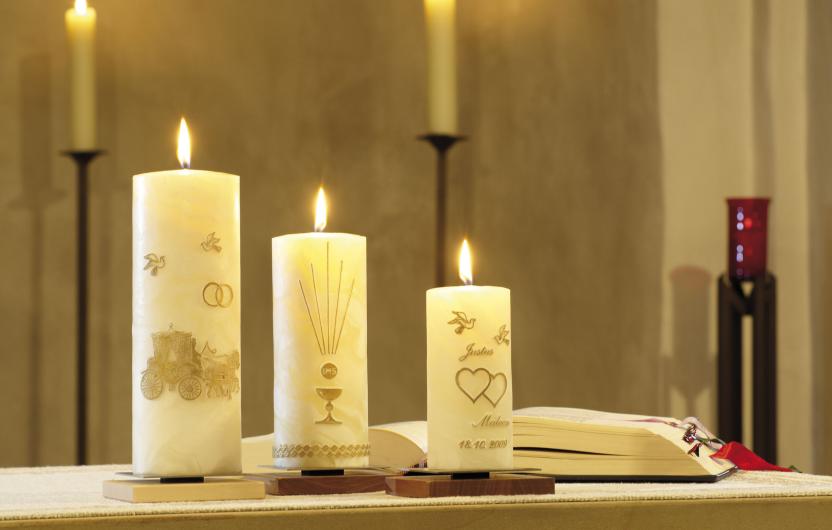 Schöne Embleme, Namen und Zahlen verzieren u. a. in goldenen und silbernen Auflagen unsere Bienenwachskerzen für Taufe, Kommunion, Hochzeit, Namens- und Geburtstage oder sonstige festliche Anlässe. Es ist schon etwas Besonderes, wenn eine dem Anlass entsprechende Ornamentkerze erstrahlt.