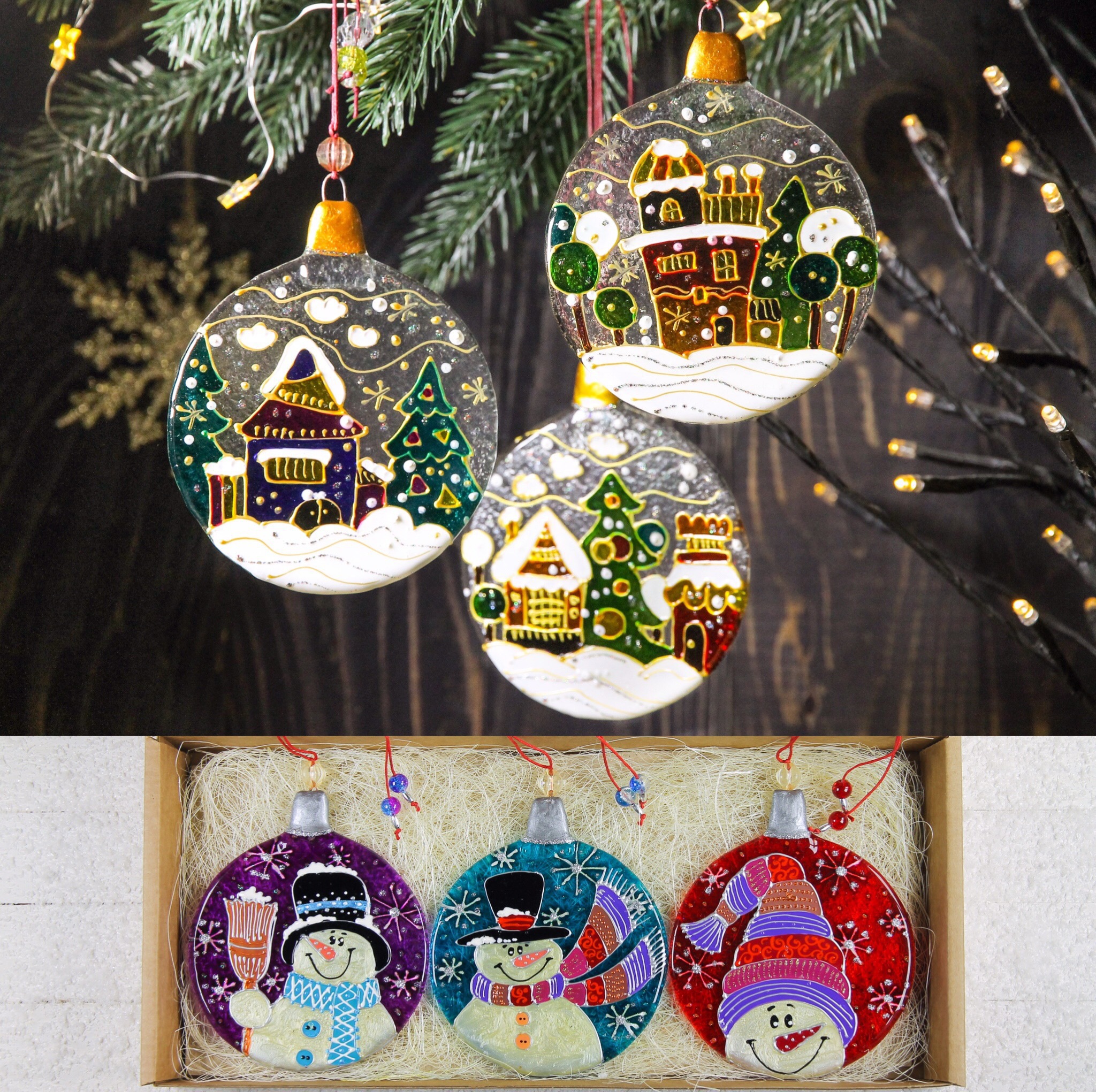 Relief hand painting "vintage" design decoration inspired by old fashion Christmas ornaments. Fused glass with ornament hand painted decor using stained-glass paints and ultra-high-strength varnish.