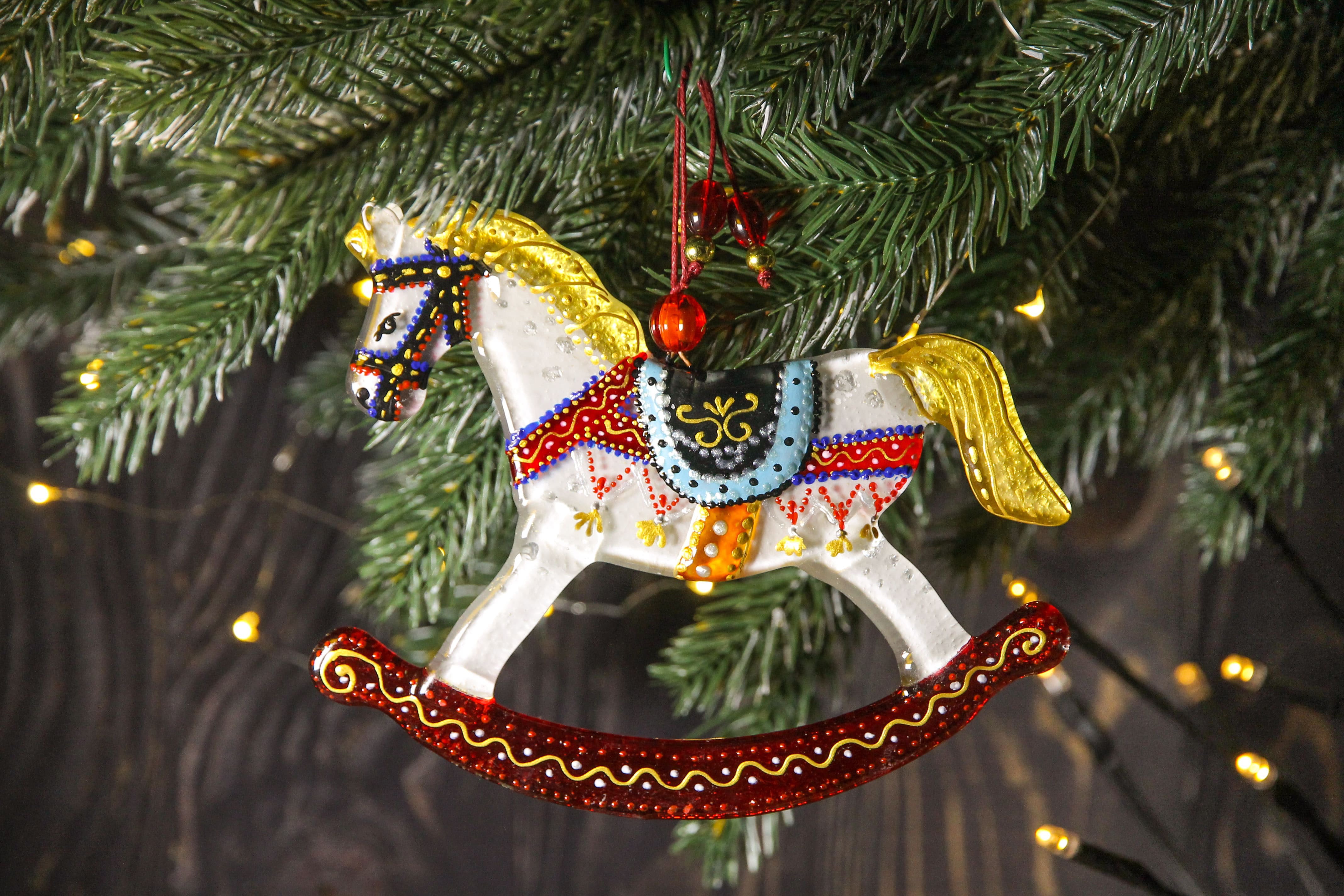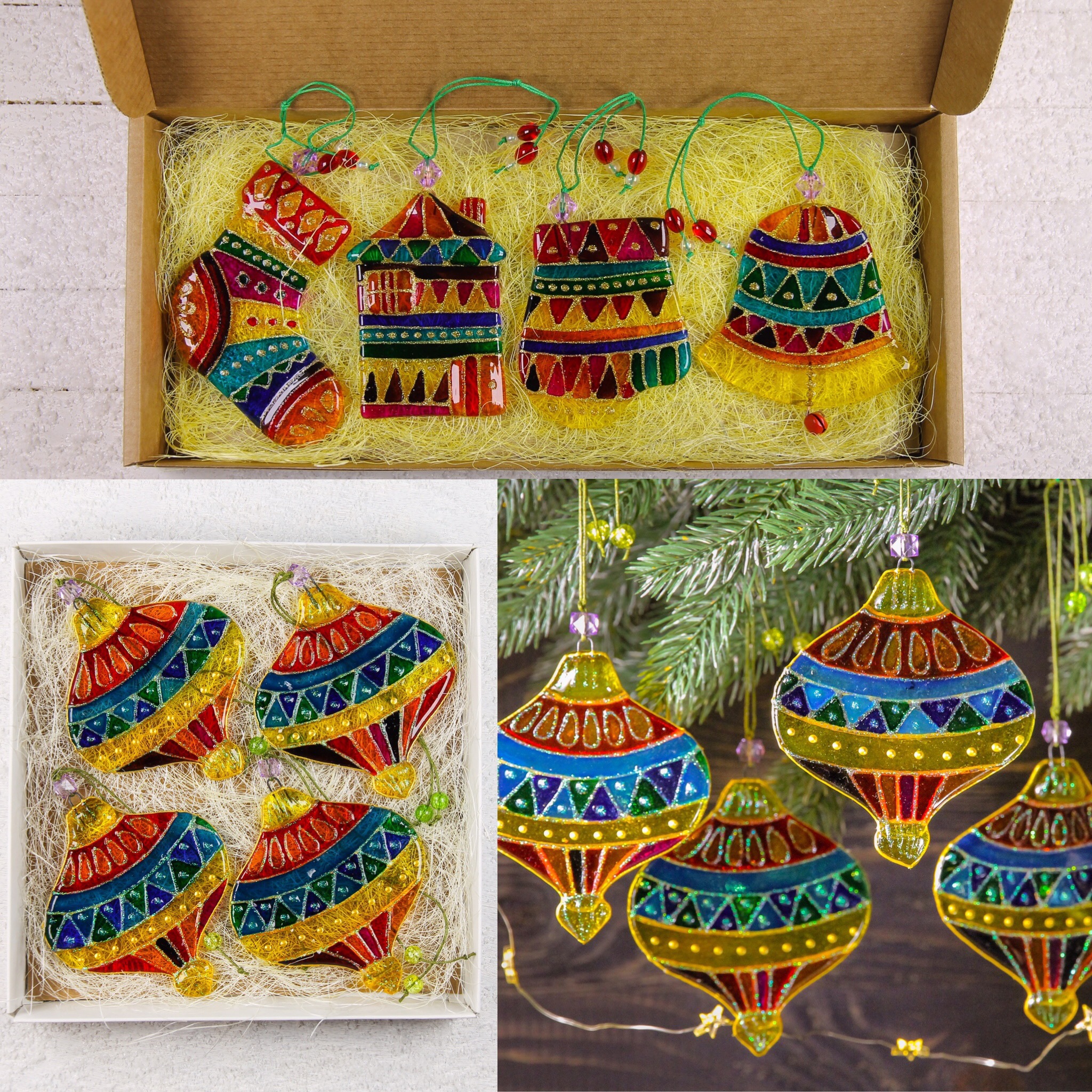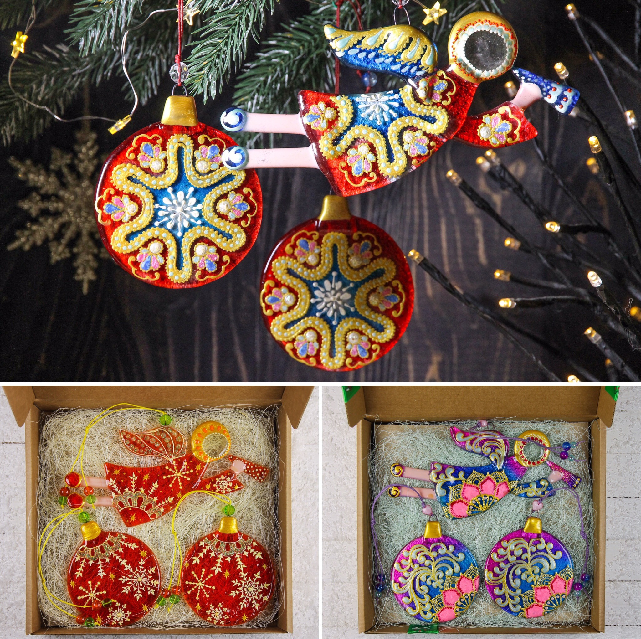 Every year before Christmas we create new sets of Christmas ornaments and tree decorations. It's a relief fused glass snowflakes or balls with hand painted Angels, funny Christmas image, geometric, vintage or fairy tale design. We made more than 200 unique design over the years! These are just a few, all hand made and hand painted using stained-glass paints and ultra-high-strength varnish.