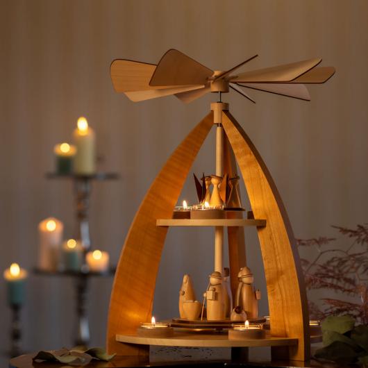 Die 2-stöckige Pyramide vereint die traditionelle Handwerkskunst mit einer modernen Interpretation und Darstellung. Die handgedrechselten Figuren sind charakterisiert durch eine minimalistische Darstellung des Geschehens der heiligen Nacht und die drei Engel in der oberen Etage begleiten es. Sie setzen sich durch neun Teelichtkerzen in Bewegung. Verschiedene Holztöne ergeben ein harmonisches Farbspiel. Wenn sie im passenden Interieur in Szene gesetzt wird, zieht sie alle Blicke auf sich.