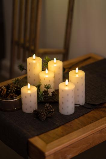 Our Sille Rechargeable is our innovative take on the classic LED vax candle. The candle has a smooth texture and flat top, which accentuates a clean and modern design. Sille features a flickering 3D flame attached to a black wick. They solely recharge uaing the Sirius DecoPower multicharger. The sides of the sets sre also covered in decorative Christmas trees, for a simple yet festive addition to your home.